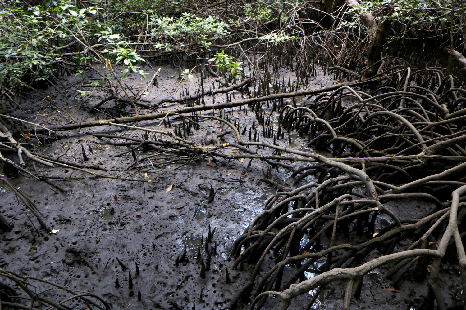 teasing the slow movement of tidal waters through their tangled branches, creating space for sediments to settle,